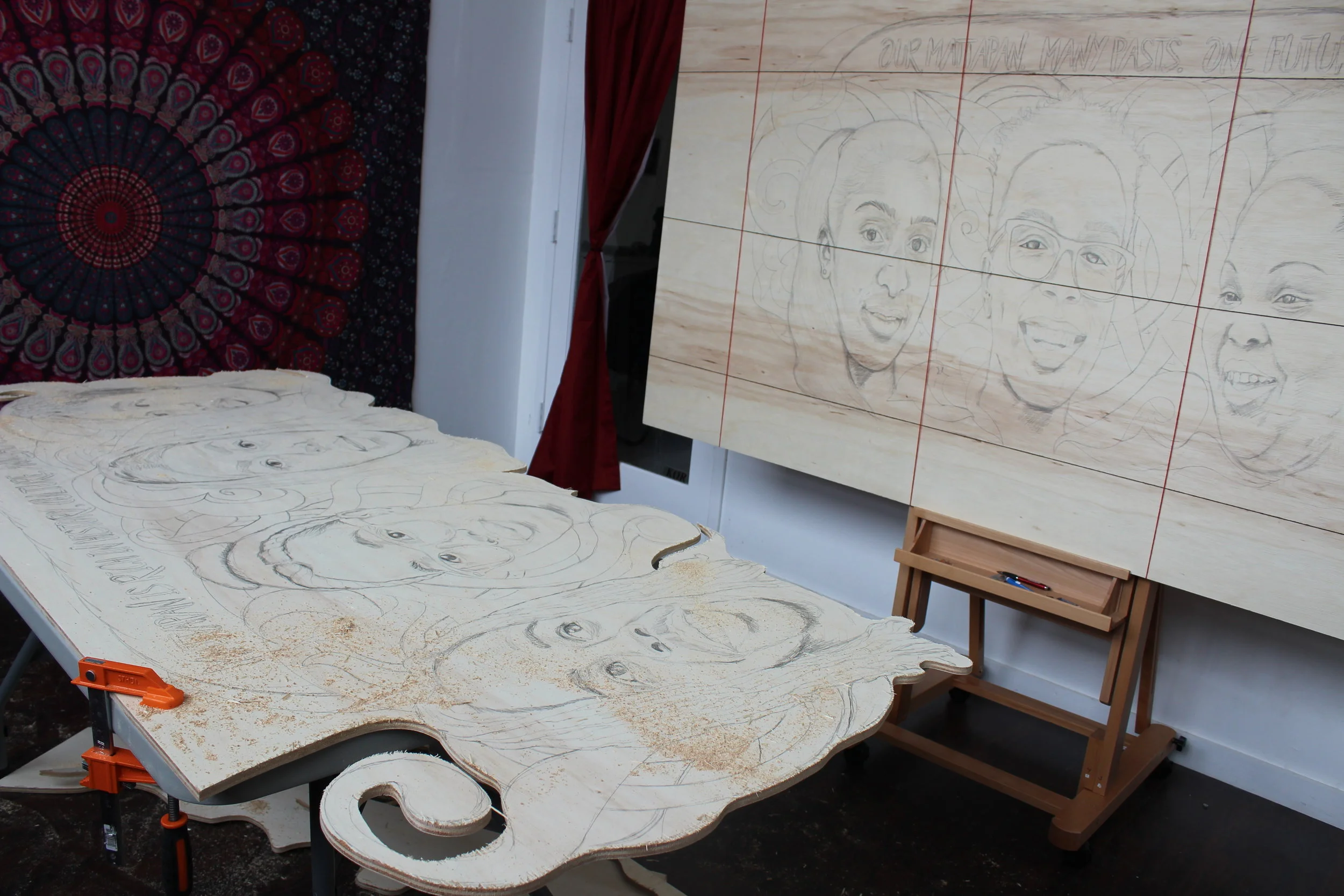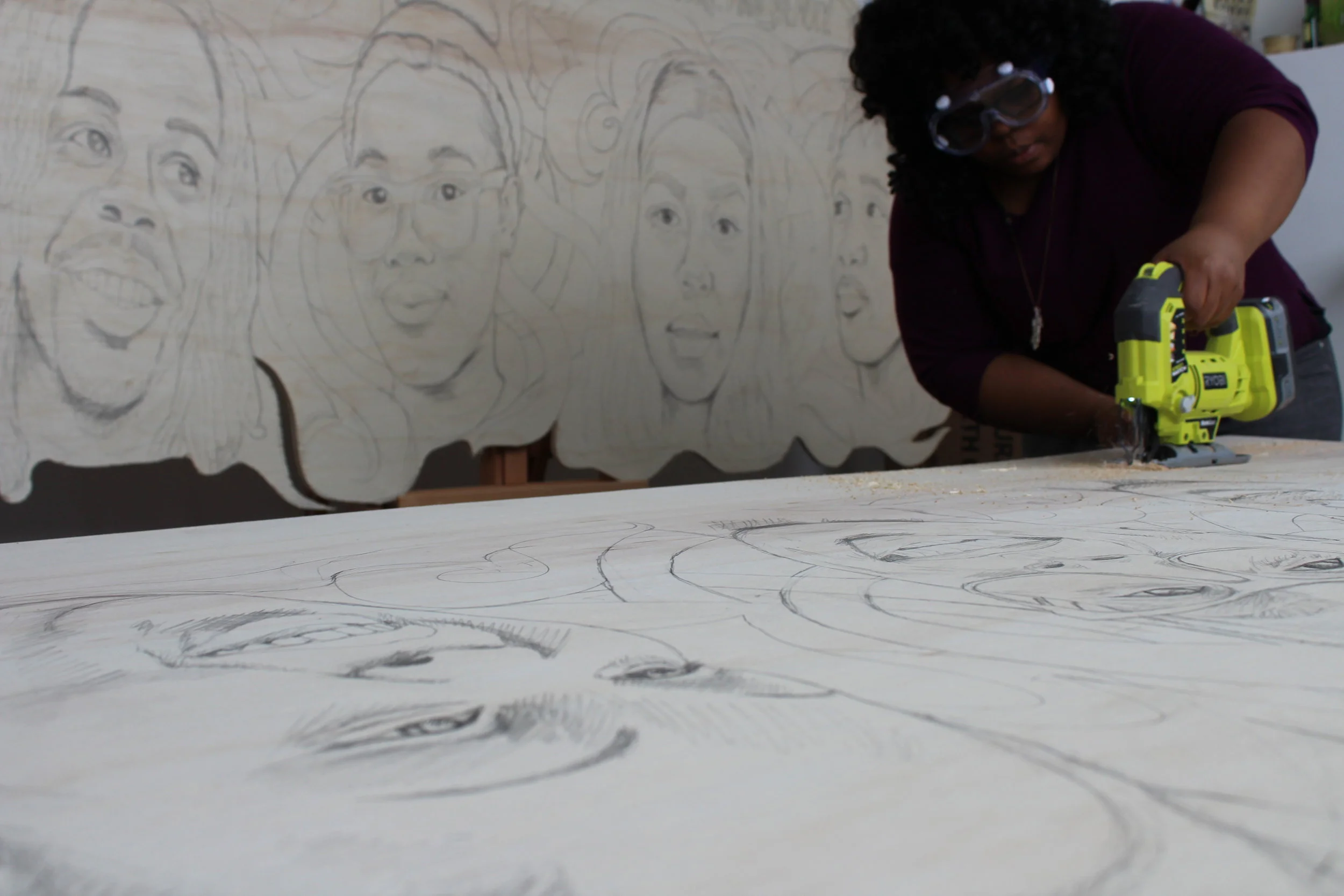 With all of the drawing done, it's time to rip off the string and start cutting with the jigsaw. All it takes is clamping things to the table and then I'm off.